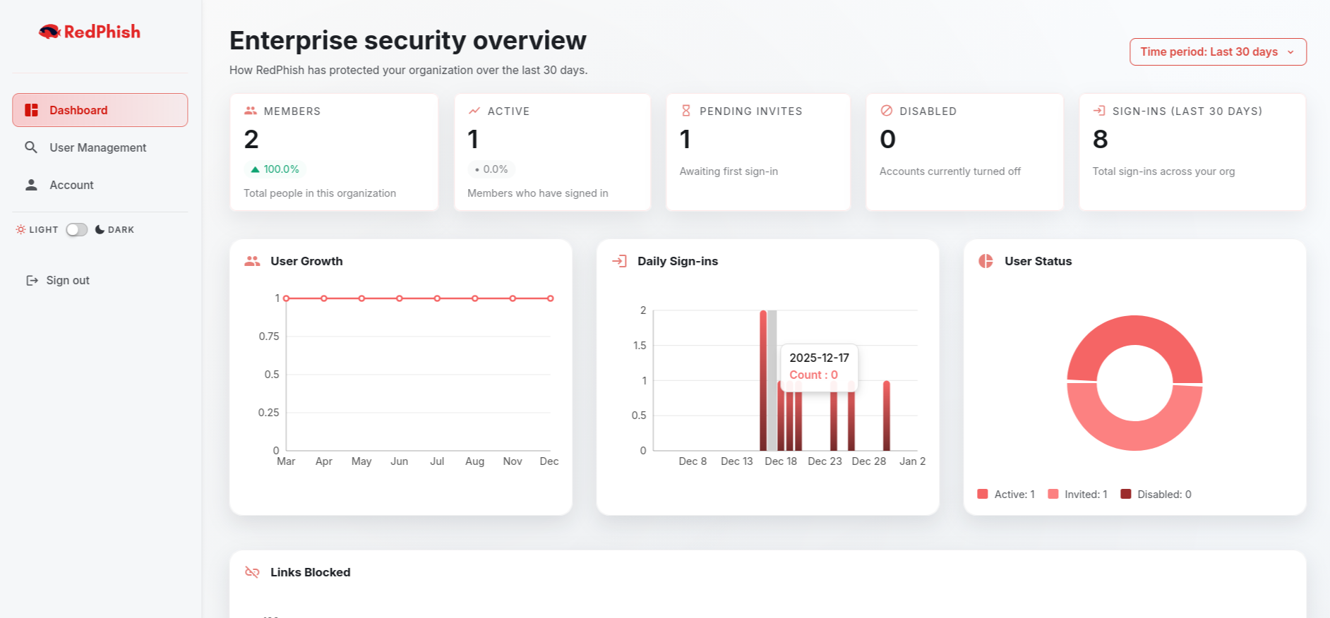 Your employees won't be able to click bad links. RedPhish Enterprise blocks threats organization-wide and gives you the dashboard to prove it.